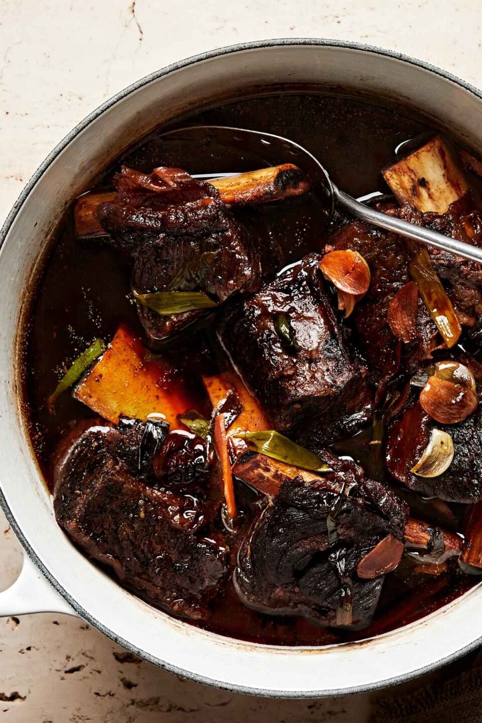 Finishing touches. Nestle the tender short ribs back into the pot with the prepared braising liquid. Let it all simmer for a few minutes until the liquid thickens and everything warms through.