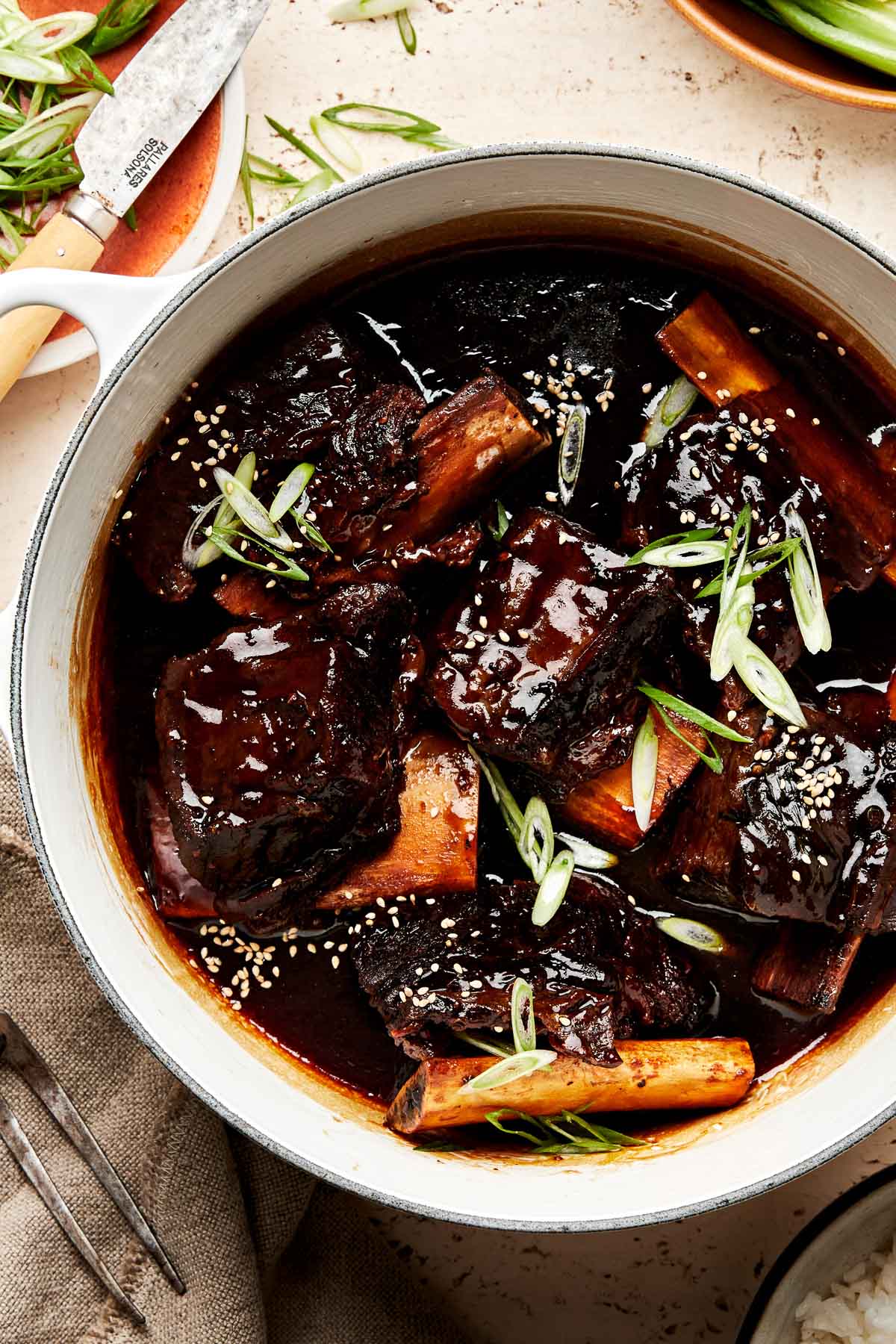 These hearty bone-in beef short ribs slowly simmer with garlic, ginger, green onions, and a savory-sweet soy braising sauce. After a long, slow braise, the tender meat falls off the bone and melts in your mouth.
