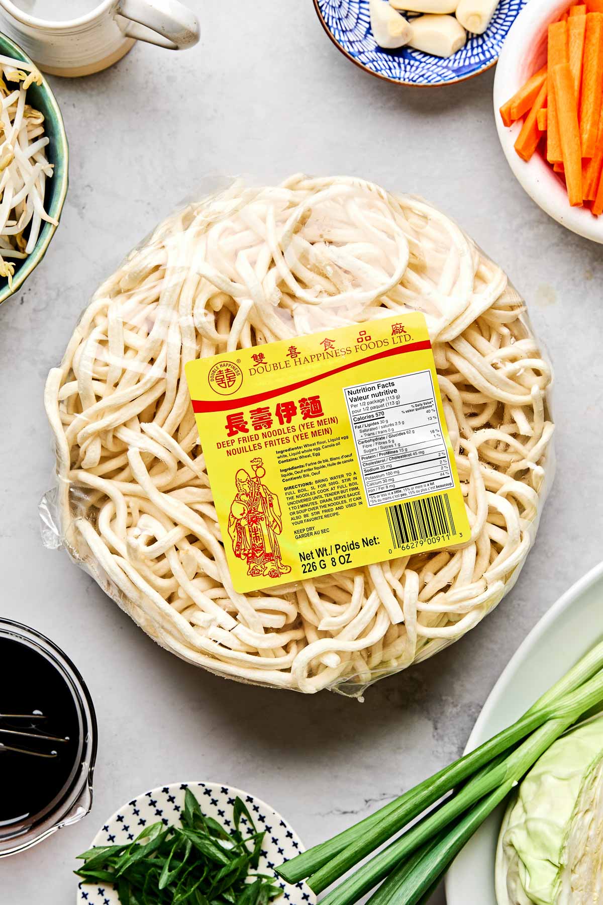 - Noodles: For the best results, use long noodles that can stand up to stir-frying without breaking or becoming mushy. Yi mein (E-Fu/longevity noodles), lo mein, and udon are all excellent choices that are typically available at Asian grocery stores or in the international aisle of well-stocked conventional grocery stores. If you prefer a gluten-free option, wide rice noodles work beautifully. In a pinch, Italian-style pasta like linguine or spaghetti works well—just cook it 2–3 minutes under al dente to avoid overcooking.