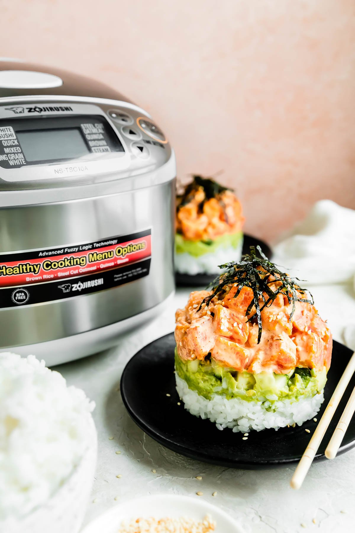 Each sushi stack layers spicy ahi tuna, cucumber, & seasoned avocado over wonderfully sticky & fluffy sushi rice. I use my to cook the rice beautifully every single time & my Japanese Great Grandma Yoshida’s sushi rice recipe to season it to perfection – a touch of family tradition in a modern twist on sushi! 🥰