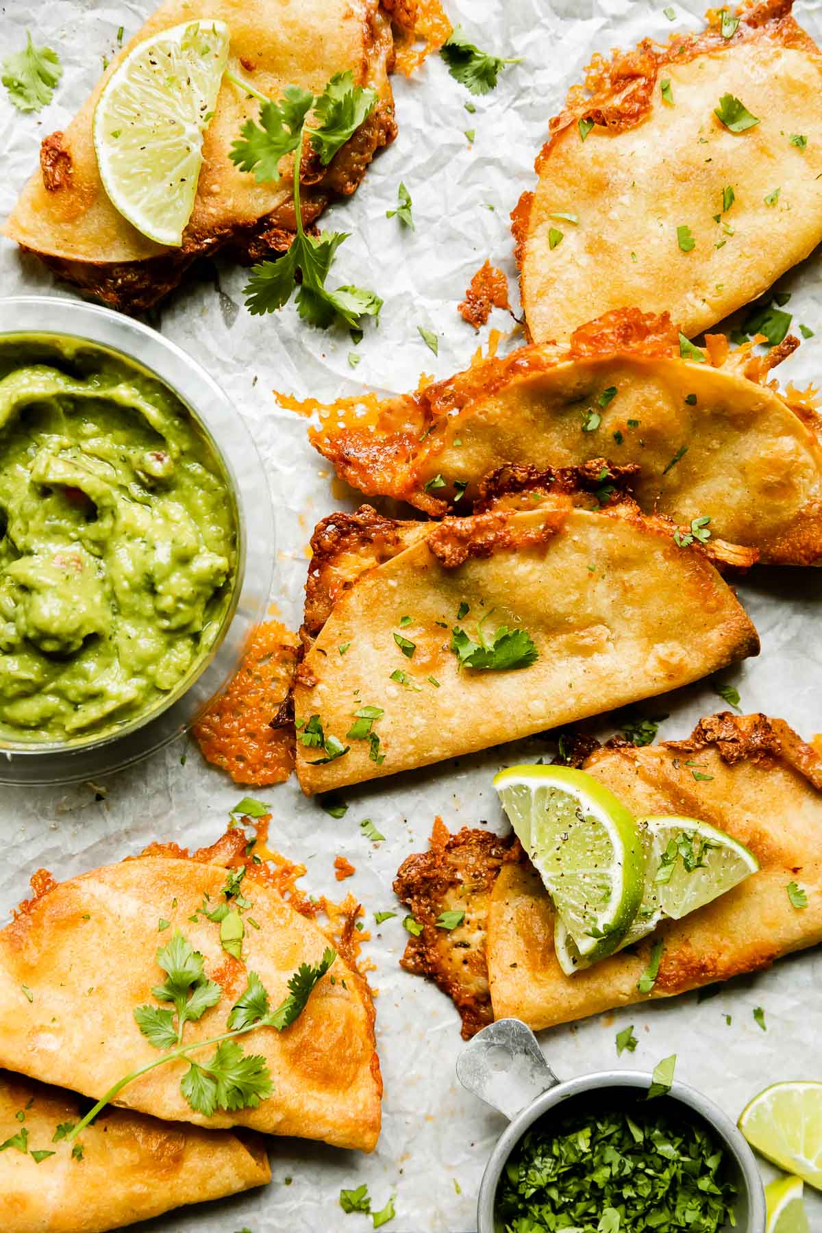 Spice up some good ol’ shredded chicken with a simple homemade taco seasoning, then fold it into tortillas with a little bit of cheese. When you bake them in the oven with high heat, the spices become fragrant, the cheese melts, & the tortillas get super crispy. It’s the perfect vessel for a bunch of toppings, so the result is kind of a cross between tacos, taquitos, nachos, & quesadillas…seriously, what’s not to love about that?!