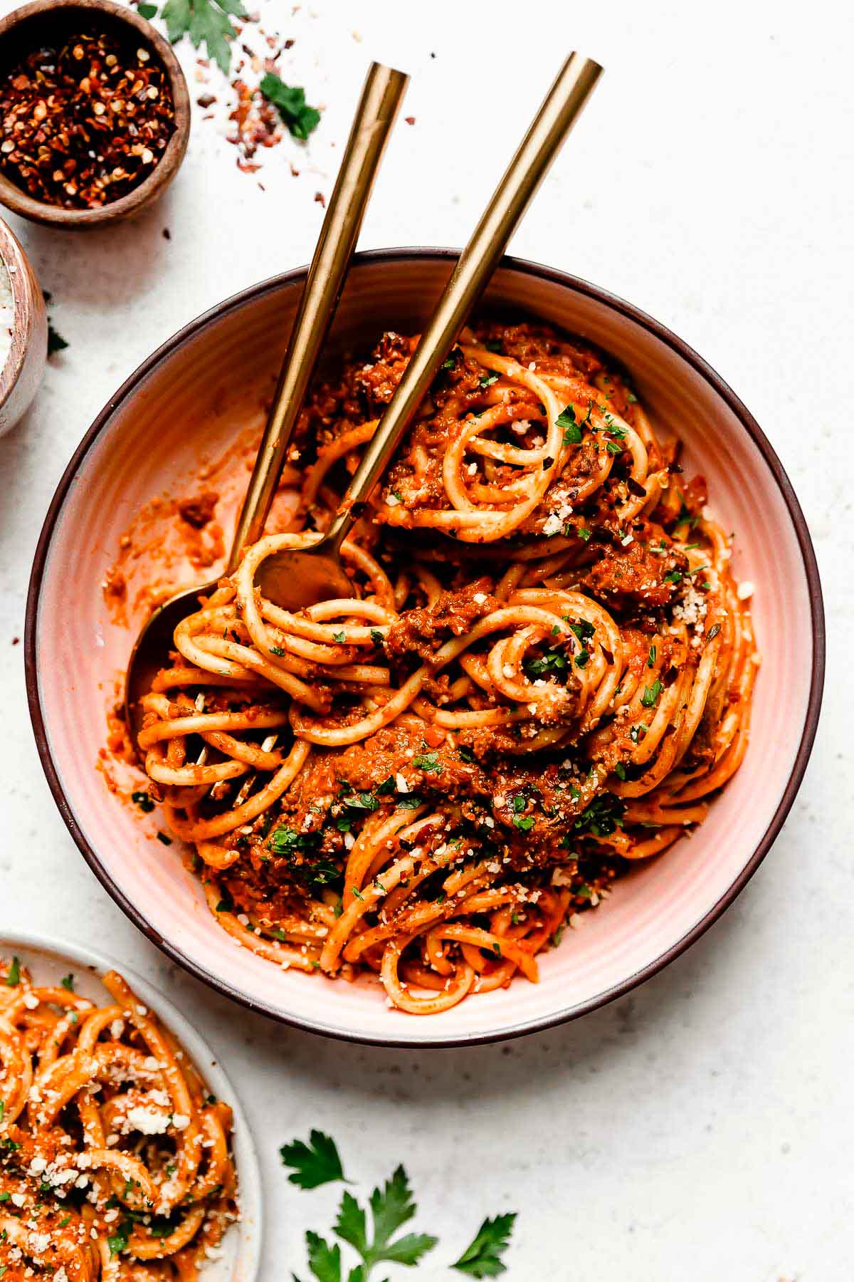The #1 mistake I see home cooks make when preparing a pasta dish is simply plopping sauce on a plate of cooked pasta. Please don’t do this! For restaurant-worthy results, always simmer your al dente pasta with the bolognese sauce before serving. To learn more, check out my complete guide for How to Cook Pasta Perfectly Every Single Time.